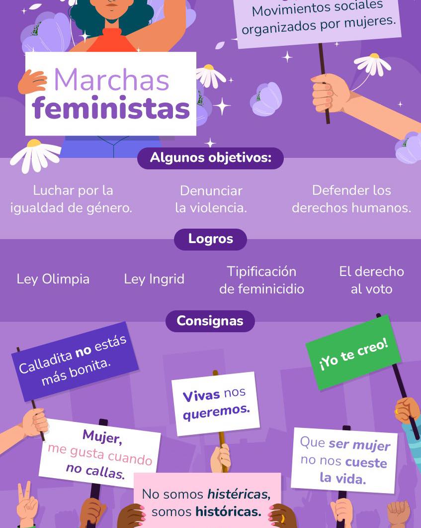 🟣 Te compartimos algunos de los logros, objetivos y consignas de los movimientos que impulsan la igualdad, la justicia y los derechos de las mujeres.💜